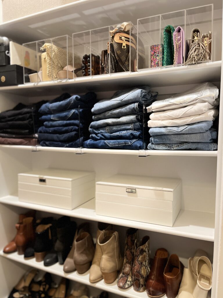 And there’s still more goodness! Our favorite light, airy baskets now hold scarves and belts, making them easy to grab without adding clutter. A sleek shoe rack keeps her favorite pairs organized and visible, and purse holders ensure her bags stay upright, structured, and easy to reach. We also added shelf dividers to neatly separate her stacks of jeans, keeping them from toppling over and making it easy to see all her options at a glance. And because no outfit is complete without accessories, we incorporated elegant jewelry holders to keep her necklaces tangle-free, earrings paired up, and bracelets easy to grab.